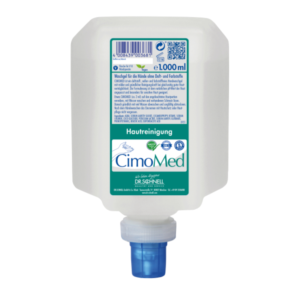 Cimomed est un gel de lavage des mains sans parfum, savon et sans colorant avec un nettoyant doux et approfondi tout en étant en même temps une bonne tolérance cutanée. Le libellé est adapté à la valeur du pH naturel de la peau et convient particulièrement à la peau sensible.
